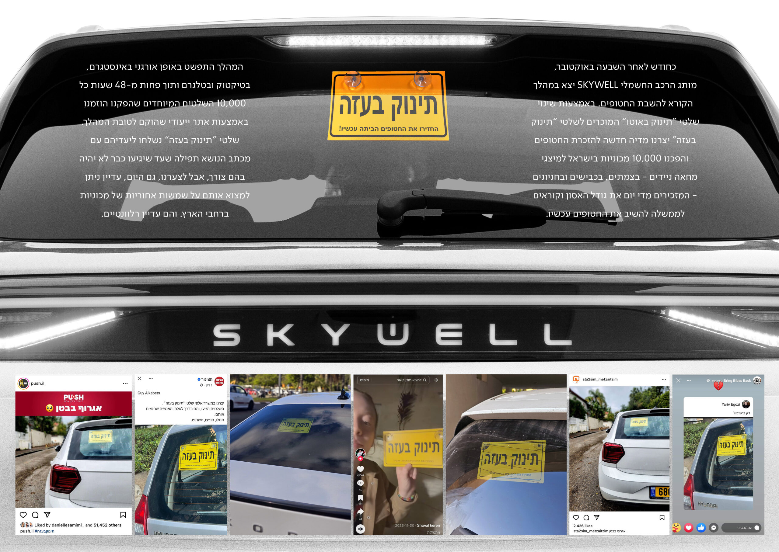 כחודש לאחר השבעה באוקטובר, מותג הרכב החשמלי SKYWELL יצא במהלך הקורא להשבת החטופים, באמצעות שינוי השלט המוכר "תינוק באוטו" ל"תינוק בעזה". 10,000 השלטים שהדפסנו וחילקנו בחינם אזלו תוך פחות מ-48 שעות, מאז צצו עוד ועוד גרסאות של השלט הזה אשר נועדו להפוך את הרכבים בישראל לתזכורות ניידות וקריאה ברורה להשבת החטופים.