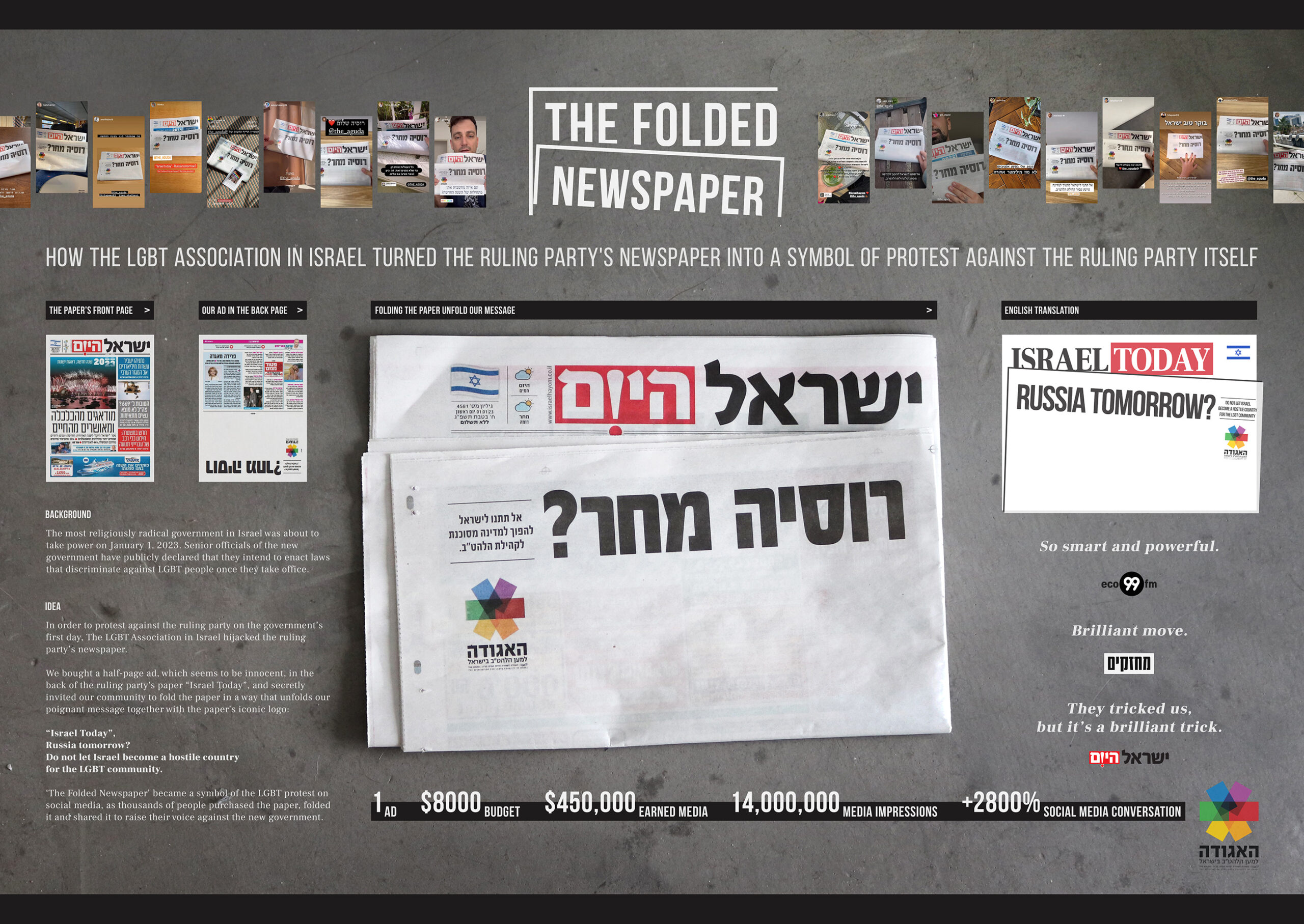 בתחילת שנת 2023, התבטאו שרי הממשלה הנכנסת נגד קהילת הלהט"ב בצורה מרחיקת לכת ואיימו להפוך את מדינת ישראל למדינה עוינת עבור הקהילה. אגודת הלהט"ב ביקשה מאיתנו לייצר מהלך מחאה וכך הפכנו את "ישראל היום" לסמל את המחאה נגד הממשלה הנכנסת. קמפיין שזכה בפסטיבל 'קאן'.